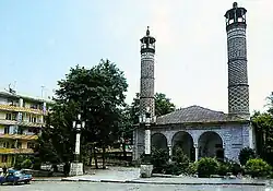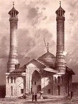 Yuxarı Gövhər Ağa Məscidi means Upper Govhar Agha Mosque in Azerbaijani, referring to the location of the mosque in the upper section of Shusha and to distinguish it from the Ashaghi Govhar Agha Mosque, the same-name mosque located in the lower section of the town. Both mosques are considered symbols of Shusha and masterpieces of Eastern architecture.[5][6] It is named after the daughter of Ibrahim Khalil Khan, Govhar Agha, who ordered the construction of the mosque to be finished. The Yukhari Govhar Agha Mosque is located on Shusha's main square, Yusif Vazir Chamanzaminli street and makes up a big part of the architectural complex including madrasa, shops, and houses built by the same architect.[1][7] According to historian and author of "Karabakh-name", Mirza Jamal Karabakhi, construction of the mosque was started with orders of Ibrahim Khalil Khan in 1182 AH (1768/1769CE), but was stopped for a long time. The construction was then restarted and completed in 1883–1885 by architect Karbalayi Safikhan Karabakhi ordered by Govhar Agha.[8]