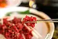 Meat in Korean cuisine has highly detailed classifications regarding freshness, quality, and part differentiation for specific cooking methods.[4] Since yukhoe uses raw beef, freshness is the most important criterion, and, for this typical dish's beef, it is recommended to use no more than one day after defrosting, and, traditionally, should not be aged more than one day after slaughtering. Regular Korean yukhoe customers are often patrons of trusted restaurants or butcher's shops which have well-known, high-quality beef distributors.[5][6][7]