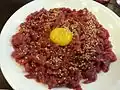 Yukhoe is most commonly made of lean cuts such as an eye of round, but more tender cuts of a beef can also be used. The beef is cut into thin strips while the fat is removed. It is then seasoned with salt, sugar, sesame oil, pepper, and garlic.[1] Korean pear, raw egg yolk, and pine nuts are commonly used as garnishes. It is similar to a Western tartare or a Levantine kibbeh nayeh.
