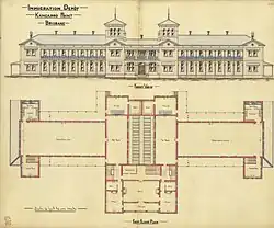 The government had been aware for some time that the immigration facilities at William Street were inadequate for their needs.[1] The decision to acquire the land at Kangaroo Point was justified by the need to provide "pleasant surroundings" for those who were recently arrived in the colony. The pattern of immigration fluctuated wildly over the years and in the period immediately preceding the construction of the Kangaroo Point depot, immigration had been at an all-time high. William Peter Clark, the successful tenderer for the work, ran into a series of difficulties with the construction which resulted in almost a year's delay in the completion. The interior layout was designed by William Hodgen and arranged in a manner typical of institutional buildings of the time. Married quarters were in the form of separate cubicles on the ground level, and single quarters (segregated by gender, and in dormitory form) on the upper level. Symmetrical pairs of laundry and privy facilities were ranged to the rear of the building.[1]