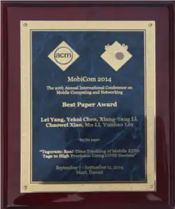 In 2014, the 20th Annual International Conference on Mobile Computing and Networking (ACM MobiCom) awards the best paper award to Liu's group for their paper Tagoram: Real-Time Tracking of Mobile RFID Tags to High Precision Using COTS Devices.[12][13][14] Yunhao and his students designed and developed Tagoram, and successfully deployed this system in Terminal One, Beijing Capital International Airport and Sanya Phoenix International Airport. The prototype ran over a year and consumed 110,000 RFID tags involving 53 destination airports, 93 airlines, and 1,094 flights. Based on the observation that the tag diversity is the key to the localization performance, they designed and implemented Differential Augmented Hologram (DAH) localization scheme, which successfully eliminated the impact of tag diversity on the localization accuracy, and improved the localization performance to millimeter-level, which was 40 times better than the state-of-the-art. The Tagoram system also won the Gold Award in Soft China Forum 2013, which is the highest honor in Chinese Software industry.[14][15] It was the first time that the conference awards its highest award to an Asian institution.