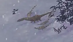 Because the three known individuals of Yutyrannus were allegedly found together, some paleontologists, including Xu Xing, have interpreted the animal as a pack hunter. Based on the presence of sauropod material in the quarry in which the three specimens were found, Xu has further speculated that Yutyrannus may have hunted sauropods, and that the three known individuals may have died while doing so.[11] In addition, other sauropod hunting theropods such as Mapusaurus are known to have exhibited pack hunting behaviour.[12] The true cause of their death, however, remains unknown.[11] If Yutyrannus did prey on sauropods, it would have been one of two predatory animals known from the Yixian formation capable of doing so, the other being an as-of-yet undescribed large theropod known from a tooth embedded in the rib of a Dongbeititan.[13]
