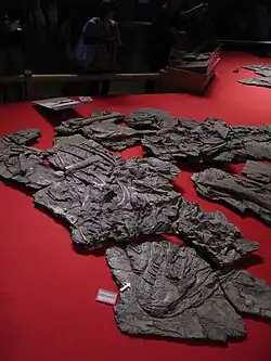 Yutyrannus is known from three nearly complete fossil specimens (an adult, a subadult and a juvenile) acquired from a fossil dealer who claimed all three had their provenance in a single quarry at Batu Yingzi in Liaoning Province, China. They were thus probably found in a layer of the Yixian Formation, dating from the Aptian, approximately 125 million years old.[1] The specimens had been cut into pieces about the size of bath mats, which could be carried by two people.[3]