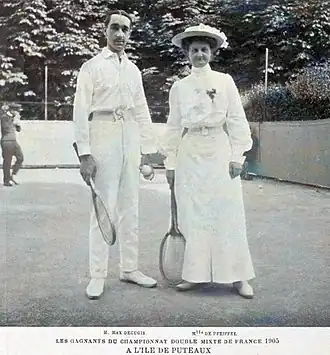 In 1907 de Pfeffel won the inaugural doubles title at the closed French Championships partnering Adine Masson.[4] Together with Max Decugis she won the French mixed championships in 1905 and 1906. In the French singles championships she was a runner-up in 1905, losing the final in straight sets to Kate Gillou. She was a member of Tennis-Club d'Auteuil and played doubles with her sister Marie-Louise.[5]