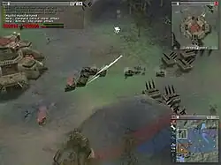 The gameplay is based around fast-paced battle action without resource gathering.[18] Winning the game requires speed and sound blitzkrieg tactics. The main aim is to gain territory by securing a sector after touching a flag.[8] Each mission begins with an introduction that includes a discussion of the goals and a preview across a sweeping landscape, briefly revealing geographical features and approaches to some strategically important flag locations. The more territory a player gains, the greater the number of units that may be built and provides more land for the construction of buildings. Unoccupied buildings that are neutral are owned with control of the sector. Each flag has a number between 1 and 5 depicted upon it.[14] The number represents a multiplier for the amount of credits a player will draw from that territory, each minute, when captured. Credits are used at factory buildings and research facilities to construct robots.