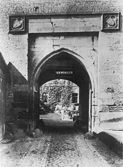 The best preserved exterior wall is on the southeast side with the main gate made from carefully cut bunter sandstone ashlars to which the drawbridge used to lead. Witnesses thereof are a deep blind niche, which frames the ogival arch of the gateway and used to house the drawbridge, and the still visible roller holes for the chains. Above the portal are two angled coats of arms whose details were probably destroyed by French soldiers in 1794.[7] They used to depict the arms of Frederick of Saarwerden and probably the Archbishopric of Cologne.[7]
