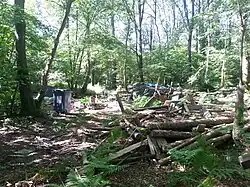 In April 2018, a large scale eviction operation began as the French state tried to regain control of the autonomous zone. After the first morning (April 9), police claimed that 10 out of 97 squats had been evicted.[1] One evicted project was a farm called 100 Noms (100 Names) which had a barn and a herd of twenty ewes.[14] On the second day (April 10), squatters employed barricades of car tyres, wooden pallets, hay bales and electricity poles which they set on fire to hamper the police, who were bulldozing the self-built houses.[15] On day three (April 11), over a thousand people attended a picnic which was then attacked by the police. Places that were evicted included la Boite Noire, Dalle à Caca, Jesse James and la Gaité.[16]