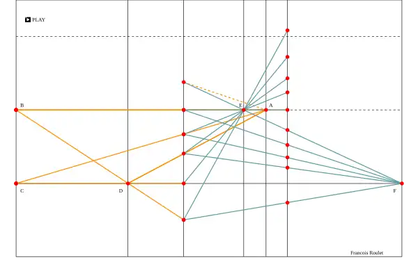 This interactive nomogram is a real geometric calculator exactly representing the rotational speeds of the transmission's 3x4 = 12 internal shafts for each of its 9 ratios (+ reverse), grouped according to their 5 permanent coupling on 4 joint ordinates and 3 independent ordinates. These ordinates are positioned on the abscissa in strict accordance with the proportions of the sun gears' teeth numbers relative to those of their rings. Consequently, the output ratios on the 6th ordinate (carrier of the fourth planetary gearset) follows closely those of the actual transmission. This advantageous geometric construction sets us free from Robert Willis' famous and tedious formula,[4] because all calculations are exclusively determined by lengths ratios, respectively teeth numbers on the abscissa for the 4 epicyclic ratios, and of rotational speeds on the 6th ordinate for the 10 gear ratios.