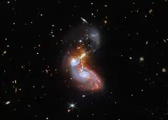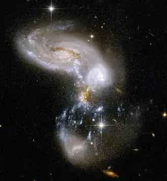 The shape of the merging galaxies is unusual; a number of powerful young starburst regions[4] hang as long, threadlike structures between the main galaxy cores. The system is relatively luminous, but has not yet reached the late stage of coalescence that is typical for most ultraluminous systems.[1]