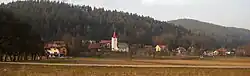 The local church is dedicated to Saint Catherine. A fragment of a fresco of Saint Christopher is preserved on its southern exterior wall, dating to the early 15th century. The church was rebuilt in the 17th and 18th centuries. The belfry dates to 1689.[4]
