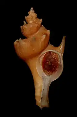 | Shell and operculum of Zacatrophon beebei (Hertlein & Strong, 1948), from off Cabo San Lucas, Mexico, in bait traps at 100 m | |