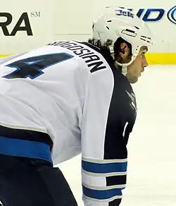 Throughout the 2009–10 season Bogosian was bothered by an injury. During a game against the Ottawa Senators on October 31, 2009, Bogosian fell behind his team's net; with his left hand lying on the net's iron frame along the ice, another player fell on top of him. The impact broke his left thumb and injured his wrist.[20] Though he did not miss any time from the injury, it had an effect on his offensive play; Bogosian was perceived to be more hesitant with the puck, choosing to pass it more often than shooting.[20] In the first 17 games of the season, he had scored 8 goals, then went 29 contests without scoring.[21] In the final 64 games, he only scored 2 goals. After he recovered, Bogosian admitted he did not play at his full capacity, but had decided not to disclose the injury to the team until the season finished in April 2010.[20] Regardless of his injury, Bogosian only missed one game throughout the season, a game on March 14 against the Phoenix Coyotes.[21] Even with these setbacks, Bogosian set career highs for games played (81), goals (10), assists (13) and points (23).[22] The 10 goals he scored tied a team record for most by a defenseman in a season, first set by Yannick Tremblay in 1999–2000, the Thrashers' inaugural year.[23] He also set a team record with 196 hits. Again the Thrashers missed the playoffs. After the Atlanta Thrashers were sold to True North Sports & Entertainment and were relocated to Winnipeg, Bogosian agreed to terms on a new two-year, $5 million contract with the Winnipeg Jets on September 14, 2011.[24]