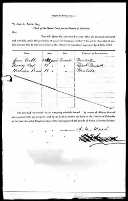 Researchers believe that Charles Porter, Tom, Jane Webb, and William some of the enslaved people brought to the White House by Zachary Taylor. In 1861, Taylor's daughter submitted Jane Webb's name to the District of Columbia Compensated Emancipation program in which the government compensated slave owners for the value of their freed slaves.[5]