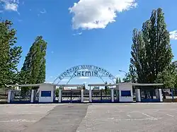 At the height of its activity, the plant occupied an area of 484 hectares (1,200 acres), criss-crossed with 120 kilometres (75 mi) of roads, 70 kilometres (43 mi) of railway sidings and 200 kilometres (120 mi) of high-voltage power grids. In 1976, the site had a workforce of 7278 people and a further 6000 worked in subcontracted companies. The premises also comprised, inter alia, a specific bus transport system, a school, a canteen, a clinic, a community center, a sports club, a stadium, a hall, a cinema, a newspaper, a printing house, workers' hotels, a fire brigade, a pig house and even its own railway station ("Bydgoszcz Żółwin").[20] Furthermore, factory blocks were added in the neighbouring "Osiedle Awaryjne". The two gates of the plant (at Wojska Polskiego and Hutnicza streets) were connected in 1953 with a tram line. The company's had a dedicated House of Culture, located next to the boat racing track on the Brda River. The facility had a common room, a library and a reading room and was equipped with musical instruments for an entire orchestra. Two fully equipped gymnasiums were built next to the House of Culture.[5]