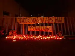 ![]() Banner on a gate at the back of the school, with the inscription: "Zauvijek u našim mislima. Počiva u miru." (translated to English: "Forever in our thoughts. Rest in peace."). | |