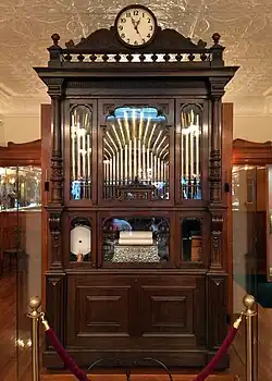In 2007, Tony Moravec, a local businessman, purchased and restored the restaurant, including purchasing the orchestrion from the collector who had bought it, at a total cost of $3.5 million and reopened it in 2009.[1][5][6] The family living quarters above the shop were also restored, and Moravec also opened the space next door as a museum of 19th-century soda fountains and mechanical musical instruments.[1][7] As of 2019, the orchestrion was the only one in the country available for the public to hear play.[3] By 2013, the building had been named to the National Register of Historic Places.[8][9]