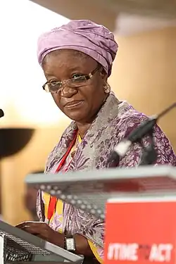 Haja Zainab Hawa Bangura (/ˈzaɪnəb ˈhɑːwə bəŋˈɡuːrə/; born 18 December 1959) is a Sierra Leonean politician and social activist who has been serving as the Director-General of the United Nations Office at Nairobi (UNON) since 2018,[1] appointed by United Nations Secretary-General António Guterres.[2] She served as the second United Nations Special Representative on Sexual Violence in Conflict with the rank of Under-Secretary-General of the United Nations from 2012 to 2017, in succession to the first holder of the post, Margot Wallström. In 2017 she was succeeded by Pramila Patten.[3][4][5]