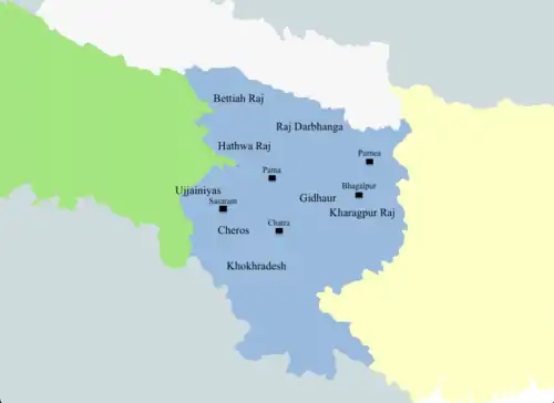 The Zamindars of Bihar were the autonomous rulers and administrators of the Bihar Subah during Mughal rule and later during British rule.[1] They formed the landed aristocracy that lasted until Indian independence in 1947.[2] The zamindars of Bihar were numerous and could be divided into small, medium and large depending on how much land they controlled.[3] Within Bihar, the zamindars had both economic and military power. Each zamindari would have its own standing army which was typically composed of the zamindar's own clansmen.[4]