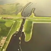 A navigation lock in the dam permits shipping connections to Middelburg and Vlissingen, via the Veerse Meer and the Walcheren navigation channel. The Zandkreekdam is 830 metres in length, and was the first compartmentalisation dam to be constructed as part of the Delta Works,[1] having been proposed by Johan van Veen as part of the Drie-Eilanden Plan (English: Three Islands Plan) which originated in the 1930s.[2][3] It was the second project constructed under the Delta Works Plan, after the Stormvloedkering Hollandse IJssel which was completed in 1958.[4][1]