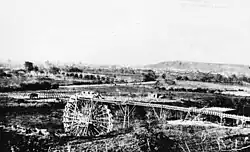 The Zanja Madre was placed close to present-day Broadway at the foot of the Elysian Hills by the river. An earth and brush dam, called a toma, was created to pool up the water into the ditch which then ran along an elevated slope down to the pueblo after which it was split into multiple ditches which ran to the various portions of lowland.[4] A large water wheel, constructed in the 1850s, took water up to the Zanja Madre and onto the main brick reservoir that was located in what is now the Plaza at the end of Olvera Street. The wheel was susceptible to damage from floods. The toma was washed away several times before a wooden one was built in its place.[5]