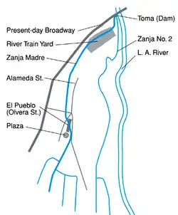 The Zanja Madre (Spanish: [ˈsaŋxa ˈmaðɾe], "Mother Trench") is the original aqueduct that brought water to the Pueblo de Los Angeles from the Río Porciúncula (Los Angeles River). The original open, earthen ditch, or zanja was completed by community laborers within a month of founding the pueblo.[a] This water system was used for both domestic uses and irrigation to fields west of town. The main zanja ultimately fed eight branch zanjas.[1] This availability of water was essential to the survival and growth of the community founded here. Brick conduits 3 to 3.5 feet (0.91 to 1.07 m) in diameter were built to improve the system after 1884. Eventually the system did not supply enough water to keep pace with population growth and irrigation demand. The system was abandoned by 1904 though portions were still used for storm water purposes.[2] It was maintained by the Zanjero of Los Angeles.