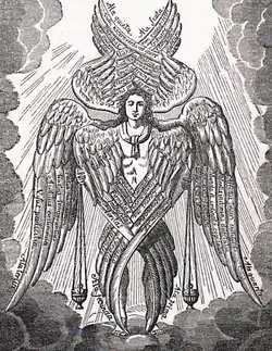 After the point of light, a figure with twelve wings on a red background, similar to some representations of cherubic angels, appears.[169][171] This is followed by a celestial flame, which refers to the concept of the soul or "life breath" and which plays an important role in the series.[172][173] The image also depicts the first light seen by a newborn child.[174] Further religious symbolism consists of a dual depiction of the Kabbalistic tree of life,[175][176] in reference to the series' Human Instrumentality Project,[177] a plan for the evolution of humanity pursued by the character of Gendo Ikari. Academic Fabio Bartoli noticed that the Tree of Life crosses Misato Katsuragi's body in the video,[178] suggesting that Misato herself was the guinea pig in Adam's contact experiment that caused the Second Impact in the series.[179] According to writers Sellées and Hernàndez-Péres, the ten sephirot represent "types of human behavior"; consequently, the Tree suggests both religion and psychology, "thus bringing together the two main thematic readings of the series".[180] They compared the Angel with twelve eyes to the traditional depiction of Ezekiel tetramorph. Sellées and Hernàndez-Péres also noted that the figure has "bird-like features" and resembles the Angel Sachiel.[181]