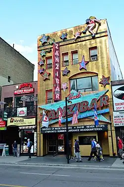 Zanzibar Tavern was opened in 1959 by David Cooper, who said: "You used to be able to hit 12 strip bars between Bloor and Queen."[2] The bar originally opened as a live music venue, one of several on Yonge Street, between Gerrard and King, in the 1950s and 1960s. It featured jazz and blues in the early 1960s, before becoming the multi-media "Zanzibar A-Go-Go" dance club featuring rock and roll and go-go dancers.[3] During this time, the bar also became the first to advertise for topless girls after many regular go-go girls refused to go topless. They hired six of the girls who responded and repurposed the uniform to be topless, with red pasties and a red collar.[4] This helped the bar's transition into a strip club during the 1970s, reflecting the transformation of the Yonge Street strip from a live music centre in the 1960s to a centre for the sex industry in the 1970s.[3]