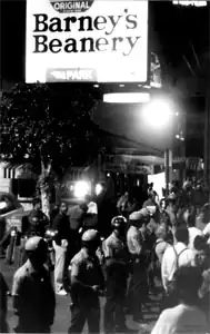 On June 28, 1969, the patrons of the Stonewall Inn, a gay bar located in New York City's Greenwich Village, resisted a police raid. Gay people returned to the Stonewall and the surrounding neighborhood for the next several nights for additional confrontations.[7] Although there had been two smaller riots — in Los Angeles in 1959 and San Francisco in 1966 — it is the Stonewall riots that have come to be seen as the flashpoint of a new gay liberation movement.[8][9]