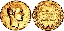 As in 1859 winners received a cash prize; in addition, the first three winners received olive wreaths and small branches of olive and laurel.[17] There was a band playing an Olympic Hymn, specially composed for the occasion. The judges were professors of the University of Athens, and there was a herald for announcing the winners. King George I was awarding the prizes to the winners at the sound of the music.[16]