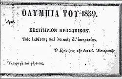 The Zappas Olympics (Greek: Ζάππειες Ολυμπιάδες), simply called Olympics (Greek: Ολύμπια, Olympia) at the time, were a series of athletic events held in Athens, Greece, in 1859, 1870 and 1875, sponsored by the Greek businessman Evangelis Zappas.[1] These games were one of the first revivals of the ancient Olympic Games in the modern era. Their success provided further inspiration[2] for William Penny Brookes in England, whose games had been running since 1850, and the International Olympic Committee series from 1896.