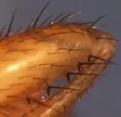 Within the genus, species with an odd number of stripes are assigned to the subgenus Anaprionus, while the species with an even number of stripes are assigned to the subgenus Zaprionus.[1][15] Species within the subgenus Zaprionus were traditionally subdivided in two species groups, armatus and inermis, based on the presence or absence of special spines on the forelegs.[16] The armatus species group was further subdivided into three species subgroups based on the type of spines.[16] The species of the armatus species subgroup have several normal spines.[16] The single spine on forelegs of the species of the tuberculatus species subgroup consists of a large spine positioned on a tubercle with a smaller spine near the base of the spine.[16] Finally, the species of the vittiger species subgroup had a row of composite spines generally positioned on small tubercles.[16]