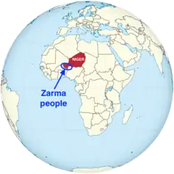 The Zarma people are an ethnic group predominantly found in westernmost Niger. They are also found in significant numbers in the adjacent areas of Nigeria and Benin, along with smaller numbers in Burkina Faso, Ivory Coast, Ghana, Togo, and Sudan.[2][3] In Niger, the Zarma are often considered by outsiders to be of the same ethnicity as the neighboring Songhaiborai, although the two groups claim differences, having different histories and speaking different dialects. They are sometimes lumped together as the Zarma-Songhay or Songhay-Zarma.[4]