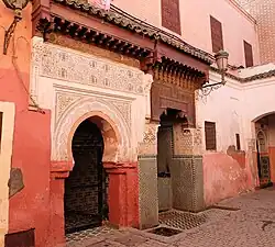 The zawiya is a complex of structures and facilities which provide for a number of services and functions. Their architecture is similar to that of other Saadian religious complexes in the late 16th century such as the Mouassine Mosque and Bab Doukkala Mosque, as well as the later Zawiya of Sidi Bel Abbes. The center of the complex is occupied by a mosque with a rectangular floor plan consisting of a nearly square courtyard (sahn) and an interior prayer hall divided into five naves by rows of arches.[8] The interior of the mosque is not heavily decorated.[4] North of the sahn is another courtyard which leads to the mausoleum chamber of al-Jazuli: a large square chamber higher than the surrounding structures and covered by a wood-frame cupola and, from the exterior, a pyramidal roof with green tiles, visible from the street and typical of Moroccan royal and religious structures.[8] Immediately on the east side of the mausoleum are two of the zawiya's main entrances, alongside a decorated street fountain. Behind these is a small chamber which served as a madrasa or school. The rest of the complex, on its eastern side, is occupied by the house of the muqaddam, a hospice for pilgrims, and a large midha (ablutions house) with a central water basin and 14 latrines.[8]