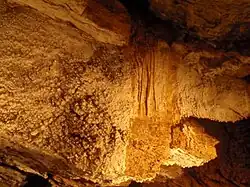 The karst process resulted in a unique microclimate of caves, characterized mainly by carbon dioxide emissions into their lower parts, and the creation of gas reservoirs.[3] Some of the caves' lower areas are filled with carbon dioxide permanently. The concentration of the gas commonly reaches 40% by volume; more than 8–10% is fatal to humans. An integral part of the security measures, therefore, is the daily measurement of carbon dioxide and adapting workers and visitors to the current situation.[9]