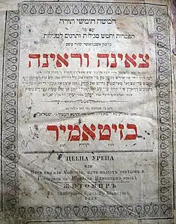 The Tz'enah Ur'enah (Hebrew: צְאֶנָה וּרְאֶינָה Ṣʼenā urʼenā "Go forth and see"; Yiddish pronunciation: [ˌʦɛnəˈʁɛnə]; Hebrew pronunciation: [ʦeˈʔena uʁˈʔena]), also spelt Tsene-rene and Tseno Ureno, sometimes called the Women's Bible, is a Yiddish-language prose work whose structure parallels the weekly Torah portions and Haftarahs used in Jewish prayer services. The book was written by Jacob ben Isaac Ashkenazi (1550–1625) of Janów Lubelski (near Lublin, Poland), and mixes Biblical passages with teachings from Judaism's Oral Torah such as the Talmud's Aggadah and Midrash, which are sometimes called "parables, allegories, short stories, anecdotes, legends, and admonitions" by secular writers.[1]