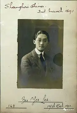 Lee was born in 1891 in Shanghai, Qing dynasty China,[1] in his ancestral home in Dinghai, Zhejiang. His courtesy name was Yizhi (翼之).[2] He studied in London, England, where he graduated from an industrial school in 1909. A year later, he entered the school of the newly established Bristol Aeroplane Company to study aviation and aircraft design.[2] Howard Pixton was one of his flight instructors.[3] On 17 October 1911, Lee flew a Bristol Boxkite on Salisbury Plain and passed the test to become the first Chinese aviator to earn a Royal Aero Club certificate (No. 148).[1][3]