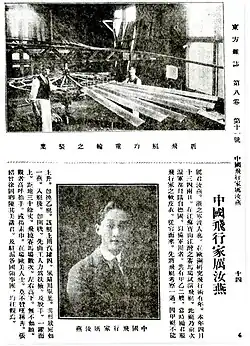 Meanwhile, the Xinhai Revolution broke out in China and toppled the Qing dynasty. At the request of the provisional Republic of China government, Lee purchased two Etrich Taube monoplanes from Austria at the end of 1911 and brought them back to China.[2] He was appointed the chief pilot of the Shanghai Military Government. On 13 and 14 April 1912, Lee flew a Taube over the Jiangwan Racecourse in Shanghai to celebrate the success of the Xinhai Revolution.[2] According to Frank Dikötter and others, Lee was the first Chinese aviator,[4] although Feng Ru, who had flown earlier in the United States, is also commonly credited as the first Chinese aviator.[5]: 163