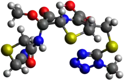 The chemical structure of cefmetazole, like that of several other cephalosporins, contains an N-methylthiotetrazole (NMTT or 1-MTT) side chain. As the antibiotic is broken down in the body, it releases free NMTT, which can cause hypoprothrombinemia (likely due to inhibition of the enzyme vitamin K epoxide reductase) and a reaction with ethanol similar to that produced by disulfiram, due to inhibition of aldehyde dehydrogenase.[1]