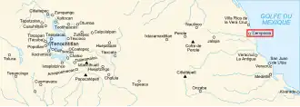 Cempoala or Zempoala (Nahuatl Cēmpoalātl 'Place of Twenty Waters') is an important Mesoamerican archaeological site located in the municipality of Úrsulo Galván in the Mexican state of Veracruz. The site was inhabited mainly by Totonacs. However, Agustín García Márquez has proposed Cempoala as a Nahua altepetl, with a particular influence from Olmeca-Xicalanca migrating from Cholula.[1] It was one of the most important Totonac settlements during the postclassical Mesoamerican period[2] and the capital of the kingdom of Totonacapan. It is located one kilometer from the shore of the Actopan River and six kilometres from the coast.