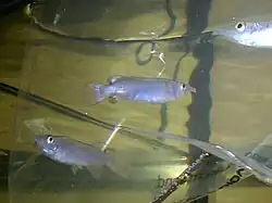 Zenarchopteridae, the viviparous halfbeaks, is a family of ray-finned fishes in the order Beloniformes. The Zenarchopteridae exhibit strong sexual dimorphism, practicing internal fertilisation, and in some cases ovoviviparous or viviparous (the family also includes oviparous species).[2][3] The members in the family are mainly found in fresh and brackish water of tropical Asia and New Guinea, but the genus Zenarchopterus also includes marine species from the Indo-Pacific. Several, such as the wrestling halfbeak, have become commonly traded aquarium fish.[4]