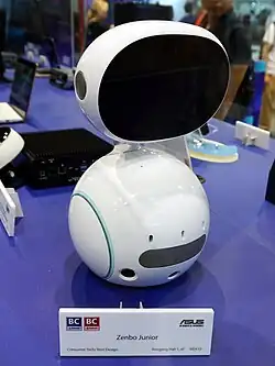 ASUS Zenbo is a Taiwanese domestic robot developed by Asus, unveiled at Computex 2016. Priced at approximately US $599, ASUS Zenbo resembles a small rolling companion with a color touchscreen “face” and a rounded base equipped with wheels.[1] Powered by an Intel processor and Intel RealSense depth‐sense camera, it was promoted as “robotic computing for every household”.[2] The name is inspired by a combination of "Zen", "robot" and "boy".[3]