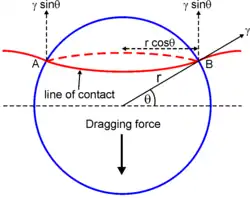 The figure illustrates a boundary intersecting with an incoherent particle of radius . The pinning force acts along the line of contact between the boundary and the particle, i.e., a circle of diameter . The force per unit length of boundary in contact is , where is the interfacial energy. Hence, the total force acting on the particle-boundary interface is