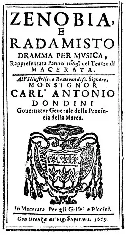 Zenobia e Radamisto is an opera in 3 acts and nine scenes by composer Giovanni Legrenzi. The opera uses an Italian language libretto by Ippolito Bentivoglio (1611–1685). The third opera written by Legrenzi, the work premiered on 1 June 1665 at the Teatro Bonacossi in Ferrara in celebration of the marriage of Nicolò Santini and Maria Luisa Bonvisi.[1][2] The opera was subsequently mounted in Brescia (1666), Verona (1667), and Macerata (1669).[3]