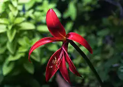 The 1–2 flowered,[6][8] but usually solitary inflorescence[13][6] with a hollow,[11] 40–70(–90) cm tall scape[12] has zygomorphic,[6] bright red flowers.[9] The flowers has 6 tepals.[7] The androecium consists of 6 stamens.[13][14] The gynoecium consists of 3 carpels.[5] The stigma is trifid.[11] The triangular[5] 1.5–2.7 cm wide capsule fruit[13] bears black, flat, winged,[5] 9–11 mm long, and 6.5–8 mm wide seeds.[13]