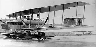 The fuselage of the L was a lattice girder built from wood and steel tubing with the forward portion covered by plywood and the rest by fabric. The crew compartment housed both pilots, the bombardier/navigator, the wireless operator and the fuel attendant. In the nose of the fuselage was the bombardardier's position and the bombsight; it could be fitted with a machine gun. Behind the crew compartment was the dorsal gunner's position armed with two flexible machine gun mounts and the ventral gunner's position with a single gun. The L was built with the R.VI's conventional landing gear with a twin-wheel auxiliary undercarriage beneath the nose for use during landing,[2] but these were replaced once the aircraft had flown to the testing site in Potsdam with two large duralumin floats.[3] Each float was subdivided into a dozen watertight compartments.[4]