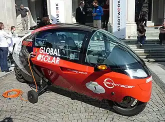 The Zerotracer is a purpose-built Electric vehicle for the Zero Emissions Race which went around the world in 2010/11. The vehicle, based on the MonoTracer by Peraves AG of Switzerland, seats two in a closed cabin, while its driving characteristics are more similar to a motorbike. The race started under UNEP patronage on 16 August 2010 in front of the Palace of Nations at Geneva where it ended on 24 February 2011 completing 80 days of travel – inspired by Jules Verne's novel, Around the World in Eighty Days. Of the only three vehicles completing the race, Zerotracer accumulated the highest score of points to win.[1]
