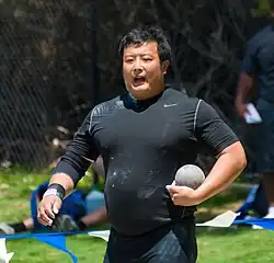 His 2010 season began with a Chinese indoor record throw of 19.90 m in March, improving upon Ma Yongfeng's long-standing record from 1989.[3] Zhang participated on the world stage for the first time later that month at the 2010 IAAF World Indoor Championships in Doha and he finished tenth in the qualifying round.[6] He performed well on the regional circuit, winning a number of Chinese and Asian Athletics Grand Prix meetings and clearing 19 metres on numerous occasions. His best throw outdoors that year was a put of 19.85 m to win the Chinese circuit final, which he followed with a win at the national championships.[7] He placed third for China at the DécaNation competition and closed the year with a silver medal at the 2010 Asian Games.[8]