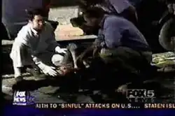 Following the collapse of the South Tower, Zeng, due to his EMT experience, collected medical supplies from his office and informed his colleagues that he was heading to the World Trade Center site to help the rescue workers and aid the injured. He called his mother and informed her that he was fine and he was going to save people, which would be his last words to her.[3] Upon his arrival at the site, he was reported to be seen alongside firemen who were assisting two injured women to safety and appeared in the news footage of WNYW-TV Fox 5 where he was seen providing emergency aid at the site.[1][4][3][5][6]
