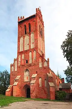 In 1440, the town joined the anti-Teutonic Prussian Confederation, upon the request of which Polish King Casimir IV Jagiellon incorporated the region and town to the Kingdom of Poland in 1454.[6] As a result, the Thirteen Years' War, the longest of all Polish–Teutonic wars, broke out, during which the local castle had been partially destroyed in battle in 1455. Following the war, in 1466, the region and town became part of Poland as a fief held by the Teutonic Knights.[7] In 1469 the town was handed over by the Teutonic Order as a fief to the von Schlieben family,[8] who built a new castle for themselves in the town. The town was damaged from fire in 1485 after being burnt by Polish troops, and suffered further fires in 1585 and 1665. Local monks were educated in the Polish cities of Elbląg, Gdańsk, Kraków and Toruń.[9] Due to limited enrollment and peripheral location to other Dominican monasteries, the local monastery did not play a major role in the Polish Province of the Dominican Order and was closed during the Reformation.[10] The castle of the Schlieben family was abandoned by 1672.