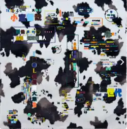 Zheng Guogu’s works in his "Through Popular Expression" display are the response of the artist to commercial trends. His work Computer controlled by pig’s brain No. 59 belongs to his series Computer controlled by pig’s brain (豬腦控制電腦). Put on the leatherette-canvas, the elements engender a corresponding ‘fancy’ effect. The Computer controlled by pig’s brain series is a refraction of how the media is overflowing and stimulating our everyday life. In this series, Zheng uses different elements of Hong Kong pop-culture magazines, which address people’s senses and their attraction to our consumerist branding culture. The M+ Museum has Computer controlled by pig’s brain No. 44, one of the works in this series, in its permanent collection. [3]